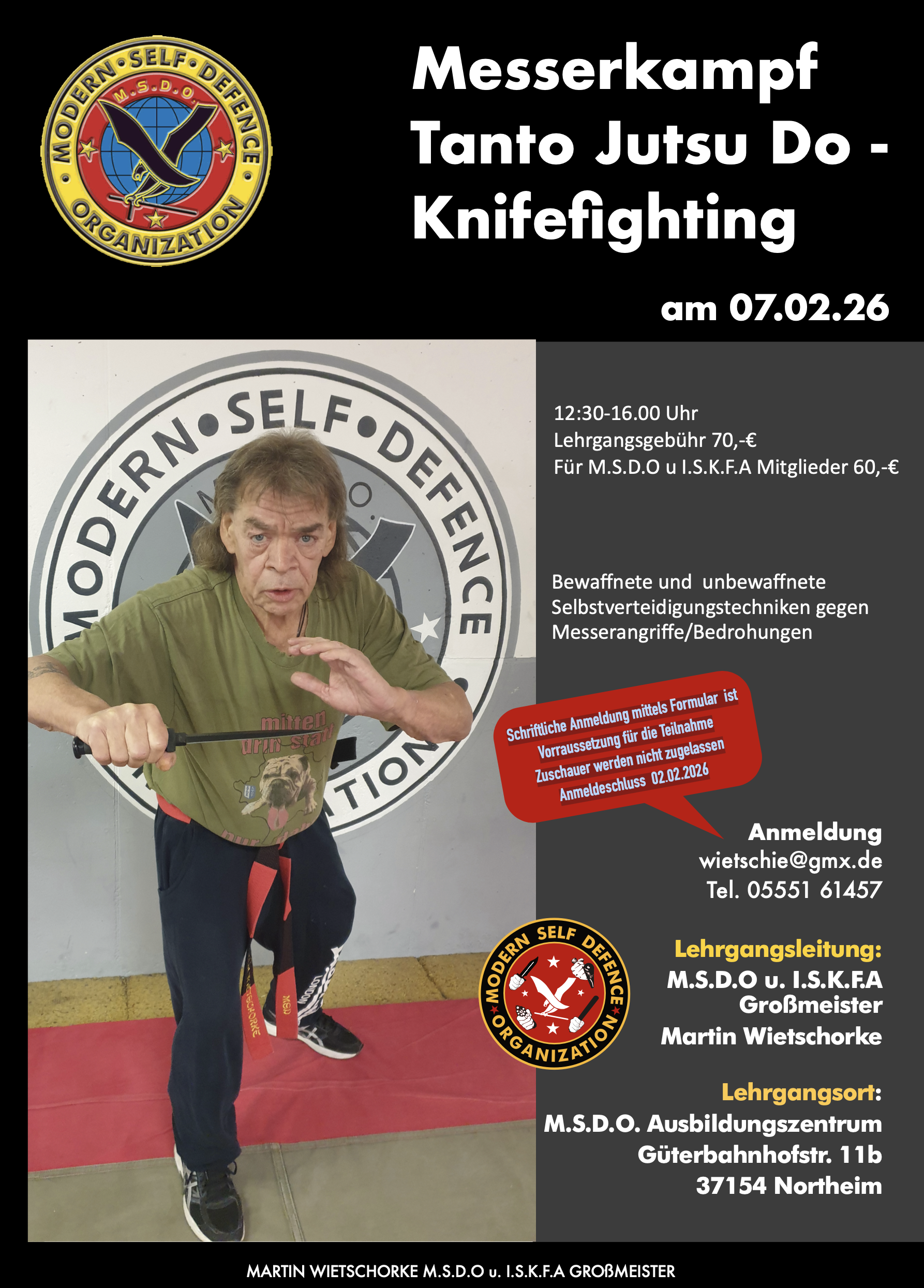 Am 25.8.2024 übergab Großmeister Wietschorke die Leitung des M.S.D.O Ausbildungszentrum Northeim e.V. seinen langjährigen Schüler Jan Leuckefeld um sich seinen Aufgaben als Großmeister , die aufgrund von stetem Zulauf, das Arbeitspennsum nach Corona wieder verdoppelt haben, gerecht zu werden. Jan und Martin verbindet ein lange Freundschaft und Ihre Zusammenarbeit basiert daher auf totalem gegenseitigen Vertrauen . Martin hatte Jan Leuckefeld bereits als Kampfsportler in der damaligen Kindergruppe ausgebildet.